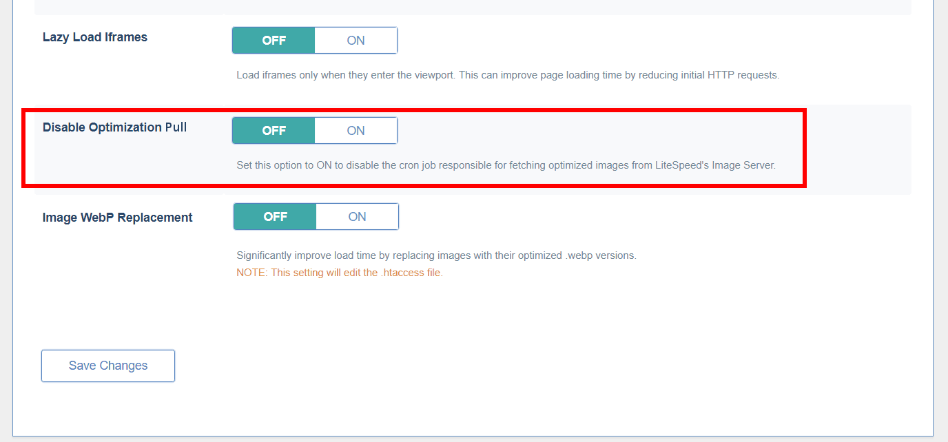 Disable Optimization Pull, when ‘ON’, will disable the cron job that is used to pull optimized images from the central server into your WordPress media library. If you turn this on, you will be unable to retrieve your optimized images.