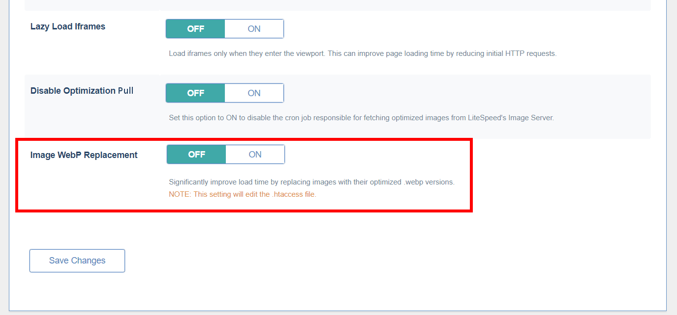 Remember the .webp file format we mentioned earlier? If you would like to use WebP images in place of all of your JPGs and PNGs, turn the Image WebP Replacement option on.