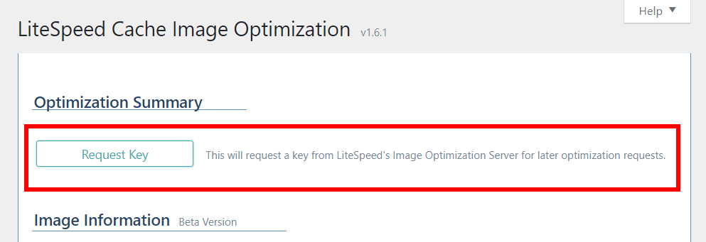The first time you visit this page, you will see a button that reads Request Key. Press the button to obtain a key from the central server that it will use to process all of your future image optimization requests. Once the key is obtained, your screen should look like the one shown below, and your API key will be listed (although most of it will be blocked out for security purposes).