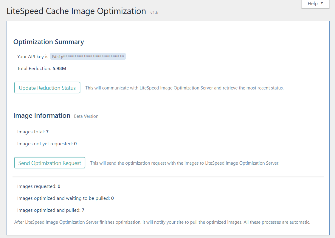Below the key is Total Reduction. It shows you how much space the server has saved with image optimization to date. This number isn’t updated automatically, so to get the most recent status you will need to press the Update Reduction Status button.