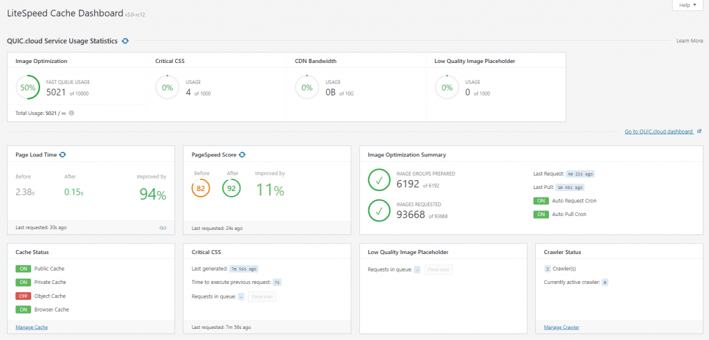 The first plugin screen is the new Dashboard section. The Dashboard allows users to keep track of their page speed and page score, crawler progress, and QUIC Cloud service usage (more on that last one later).