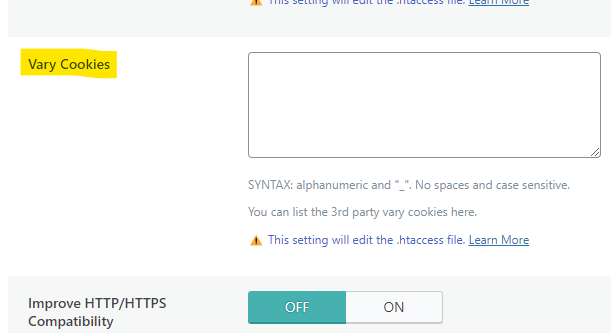 - The Vary Cookies setting in Cache > Advanced